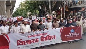 বুধবার বিকাল ৫ টায় ছাত্রশিবির, ঢাকা মহানগর পূর্ব শাখার উদ্যোগে বায়তুল মোকাররম জাতীয় মসজিদের উত্তর গেট থেকে এই বিক্ষোভ মিছিল বের হয়।